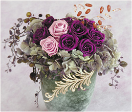 シックな色目のバラ・アジサイに、スモーク加工されたガラスポットの組み合わせ。 上品な高級感ただよう、ミドルサイズのプリザーブドアレンジ。